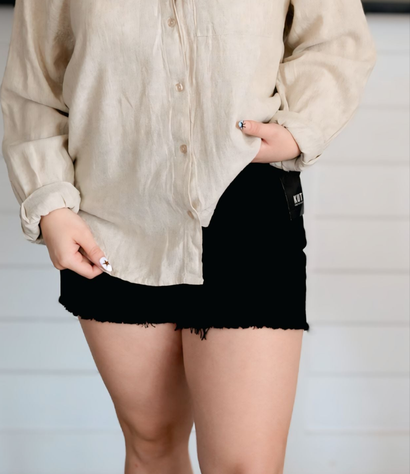 - A softly frayed raw-edge hemline lends an old-favorite aesthetic to classic denim cutoff shorts cut with a high waist and rendered in an inky-black wash.